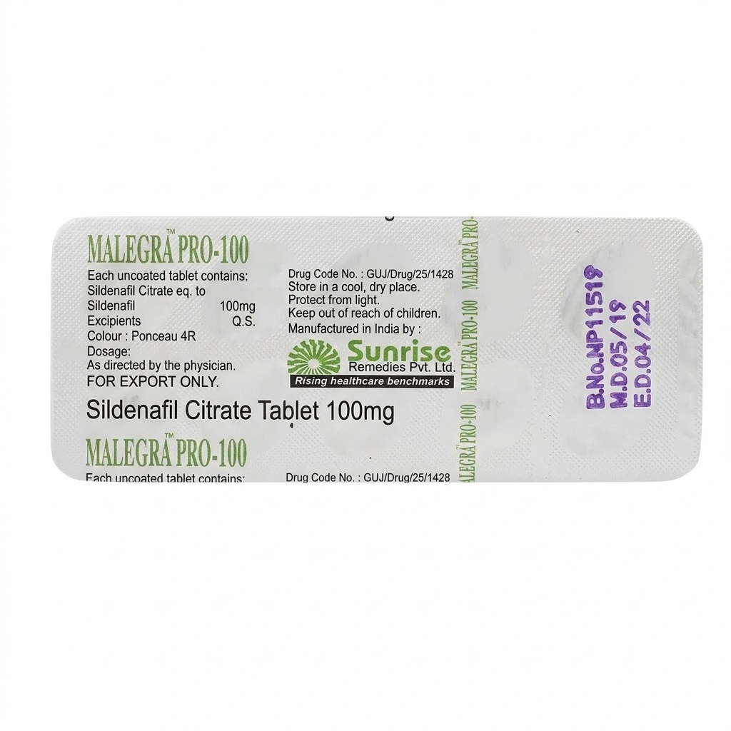 Malegra Pro 100mg contains Sildenafil Citrate, the same as Viagra is used in the treatment of impotency in males or erectile dysfunction.