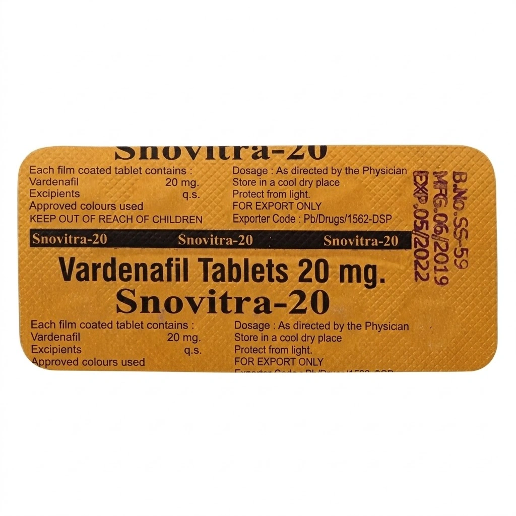 Snovitra 20mg is a tablet containing 20mg Vardenafil, manufactured by Parex Pharmaceuticals (India). It is used to treat erectile dysfunction and is known for balanced performance and a favorable side-effect profile compared to some other ED treatments—delivering effective results while often being well tolerated.