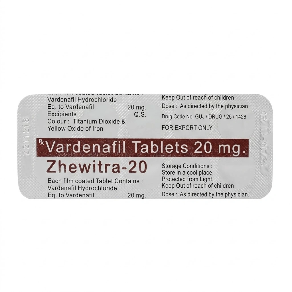 Zhewitra 20mg is a tablet containing 20mg Vardenafil, manufactured by Sunrise Remedies (India). It is indicated for erectile dysfunction and offers the balanced performance and favorable side-effect profile associated with Vardenafil—often preferred by men who want strong results with potentially fewer side effects than older ED options.